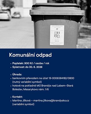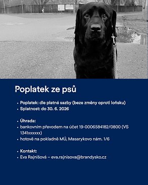 Splatnost poplatku je 30. června. Uhradit jej lze bankovním převodem na účet města: 19-0006584182/0800 (nutné je uvést přidělený variabilní symbol) nebo hotově na pokladně Městského úřadu Brandýs nad Labem-Stará Boleslav (Masarykovo náměstí č.p. 1/6).